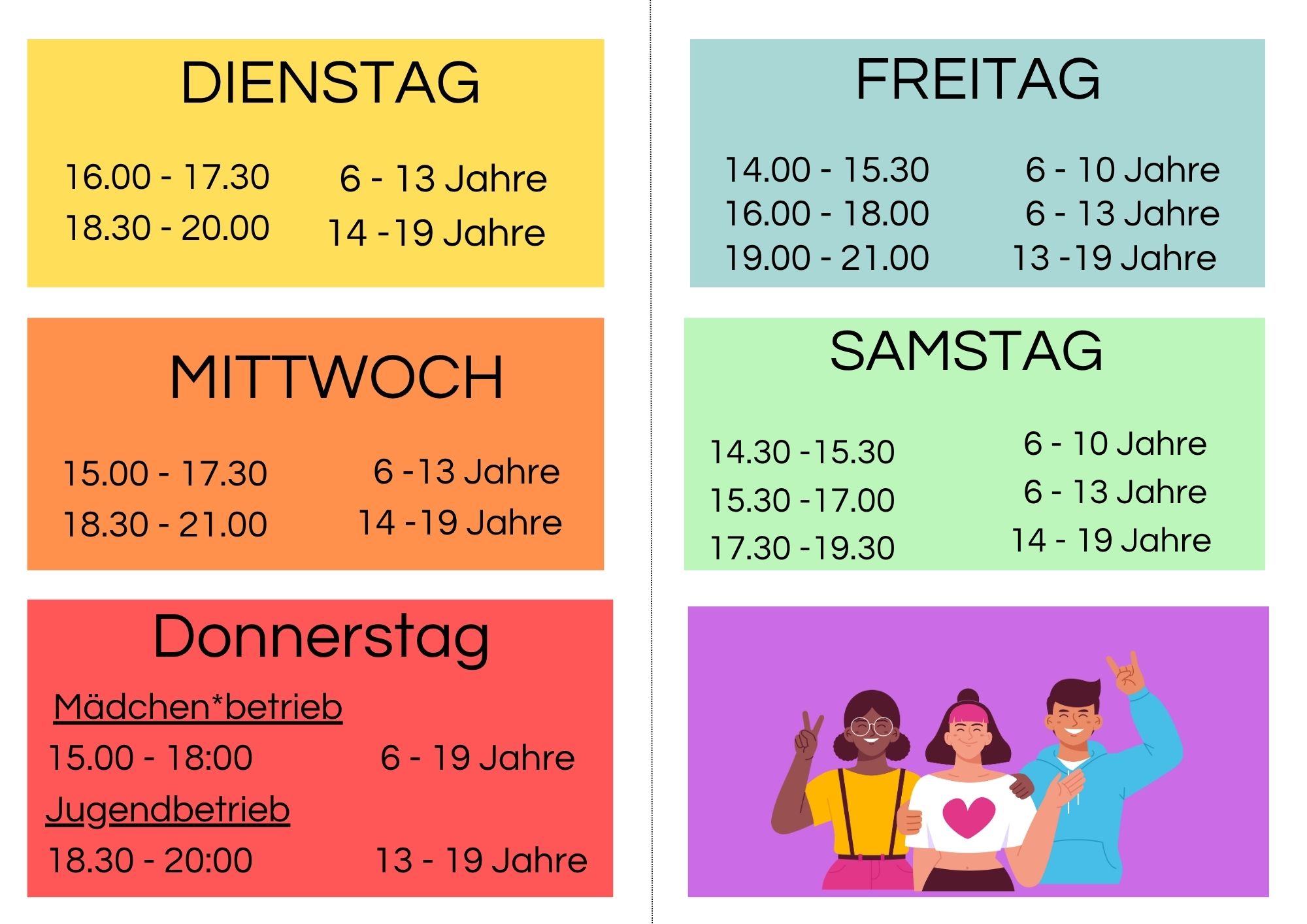Das Jugendzentrum Rennbahnweg befindet sich im gleichen Gebäude wie die Volksschule und die NMS Mira Lobe. Den Kindern und Jugendlichen stehen ca. 600 m² zur Verfügung: Ein großer Aufenthaltsbereich mit Sofas, Tischfußballtisch, Billardtisch, vielen Spielen etc. Außerdem gibt es einen Bewegungsraum für Sportangebote. Darüber hinaus gibt es noch einen Tischtennisraum, ein kleines Tonstudio, eine Disco, ein Mädchen*zimmer sowie eine Werkstatt zum Werken und Basteln.