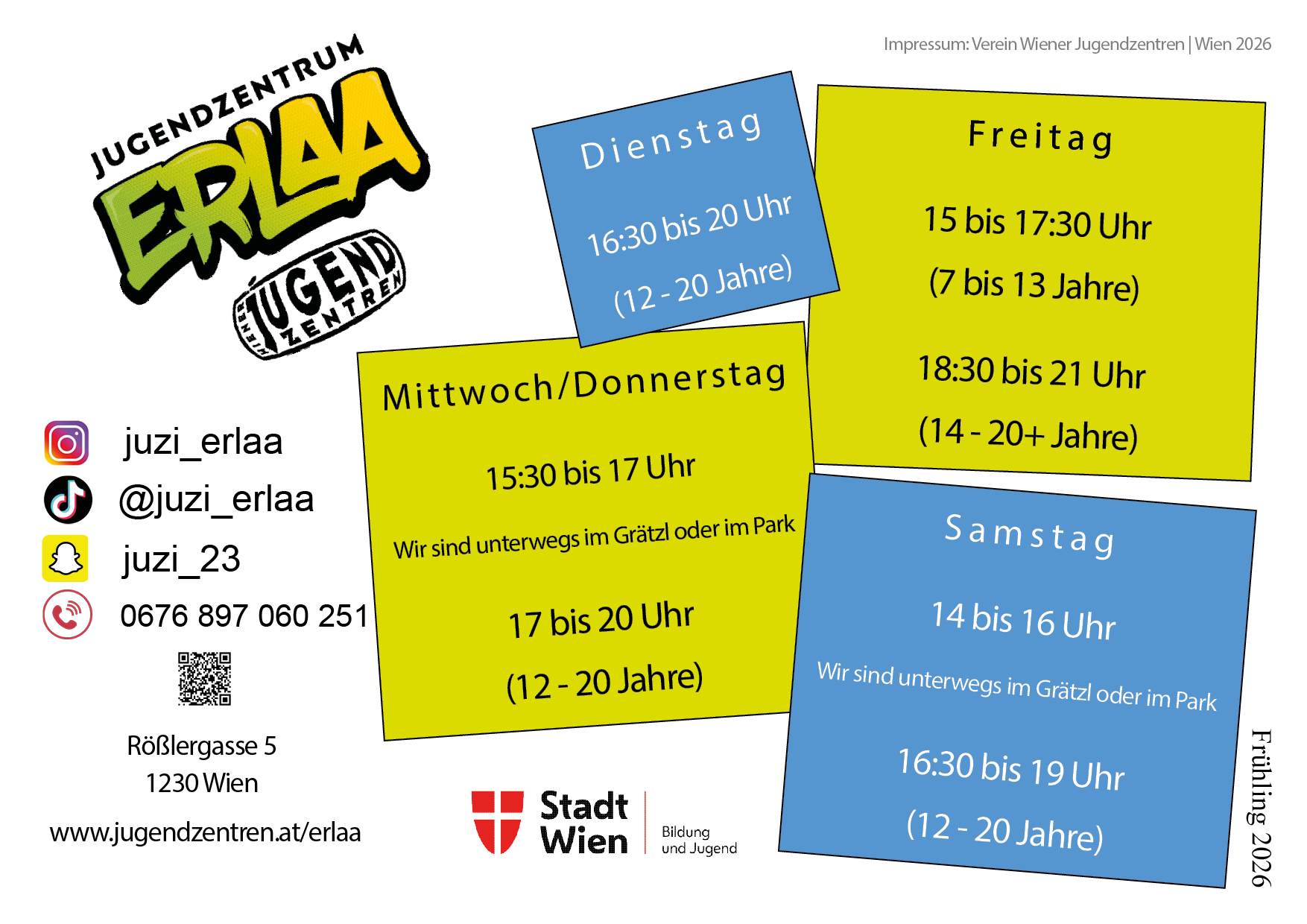 Das Jugendzentrum Erlaa setzt zahlreiche Angebote im jugendkulturellen Bereich, Schwerpunkte sind u.a. Tanz und Musik. Die neue Einrichtung ist barrierefrei, hat Tanzräume mit Spiegelwänden, einen Veranstaltungsraum für Events, Spiel- und Bewegungsangebote sowie einen (Band)Proberaum. Außerdem gibt es natürlich wieder spezielle Mädchen*- und Burschen*-Angebote. Schaut vorbei!