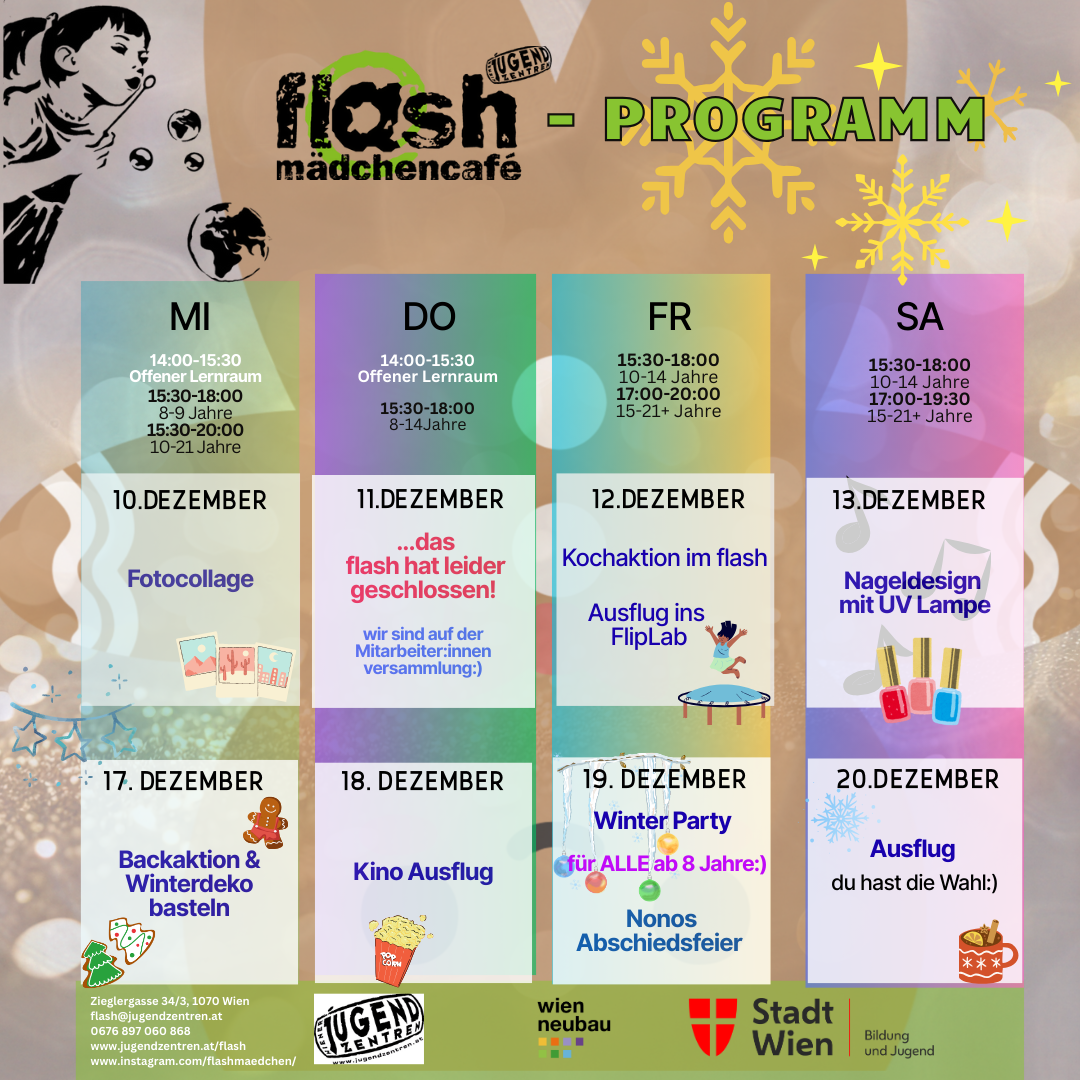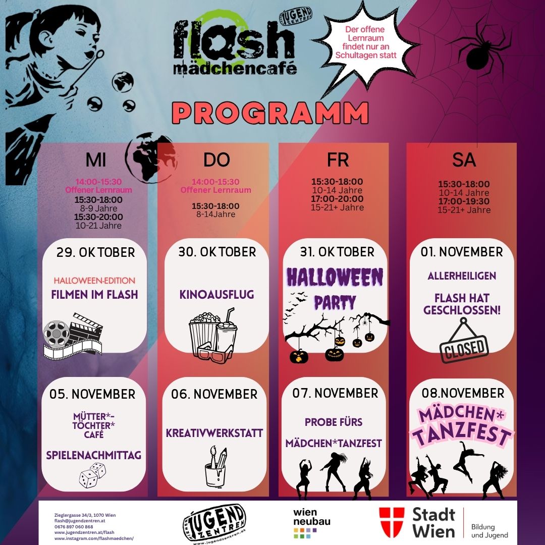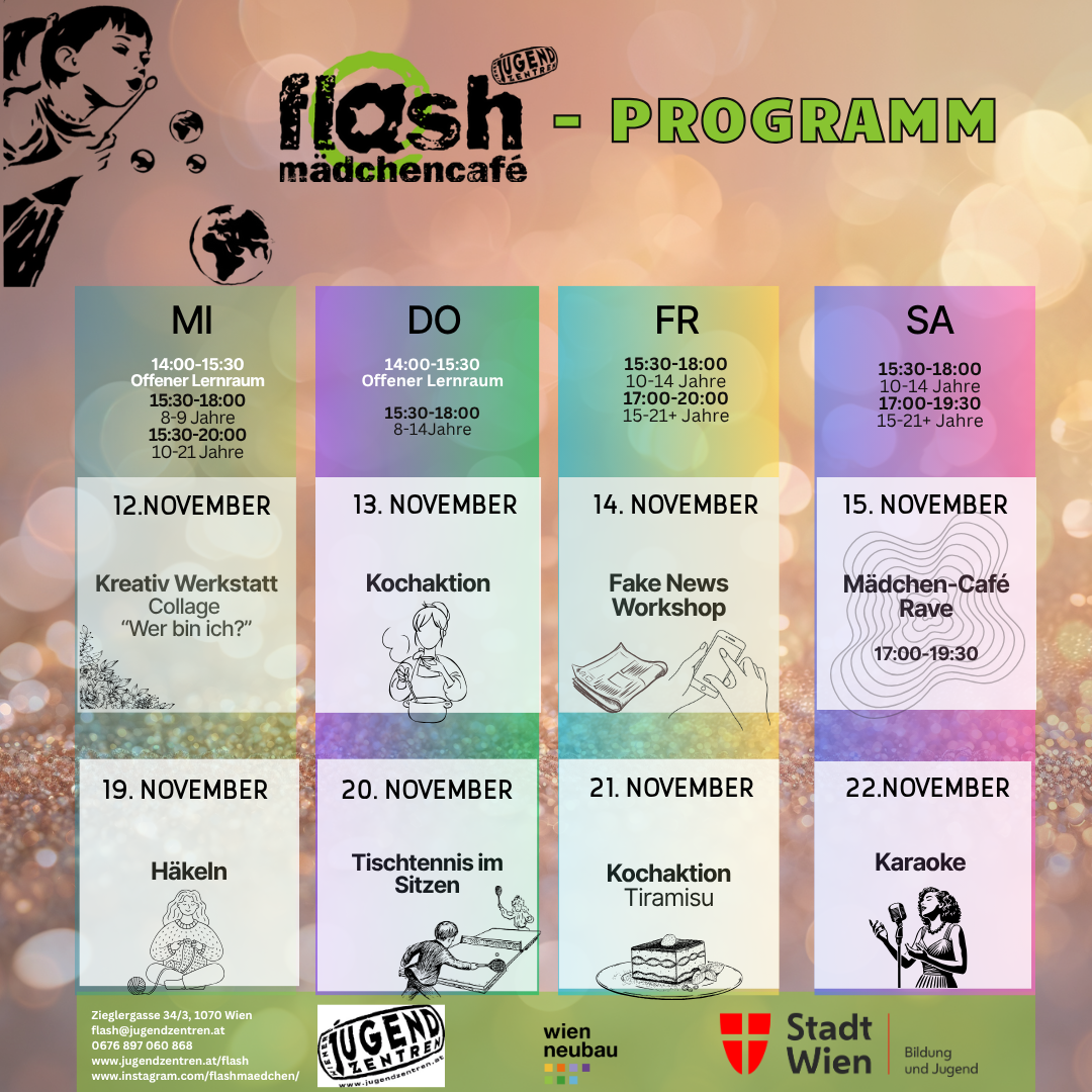 Das flash ist ein partizipatives Mädchen*café, ein Raum nur für Mädchen* und junge Frauen*, die ihre Freizeit hier verbringen wollen. Auf 120 m2 gibt es im Cafébereich eine Bar, PCs mit Internet, WIFI, die Schreibwand und Infomaterial. In der Disco gibt es eine Bühne mit Musikanlage, Beamer, Spiegel für Tanzen, Singen und Bewegung, sowie einen Wuzzler. Im Chillraum, mit Hochbett und Boxsack, kann man sich auch mal zurückziehen oder austoben. Im Hof gibt es eine Graffitiwand und den Mini-Garten. Der Gehsteig vor dem flash kann im Sommer mitgenutzt werden.
