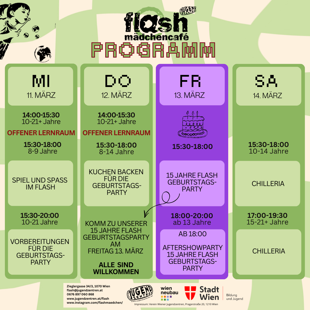 Das flash ist ein partizipatives Mädchen*café, ein Raum nur für Mädchen* und junge Frauen*, die ihre Freizeit hier verbringen wollen. Auf 120 m2 gibt es im Cafébereich eine Bar, PCs mit Internet, WIFI, die Schreibwand und Infomaterial. In der Disco gibt es eine Bühne mit Musikanlage, Beamer, Spiegel für Tanzen, Singen und Bewegung, sowie einen Wuzzler. Im Chillraum, mit Hochbett und Boxsack, kann man sich auch mal zurückziehen oder austoben. Im Hof gibt es eine Graffitiwand und den Mini-Garten. Der Gehsteig vor dem flash kann im Sommer mitgenutzt werden.