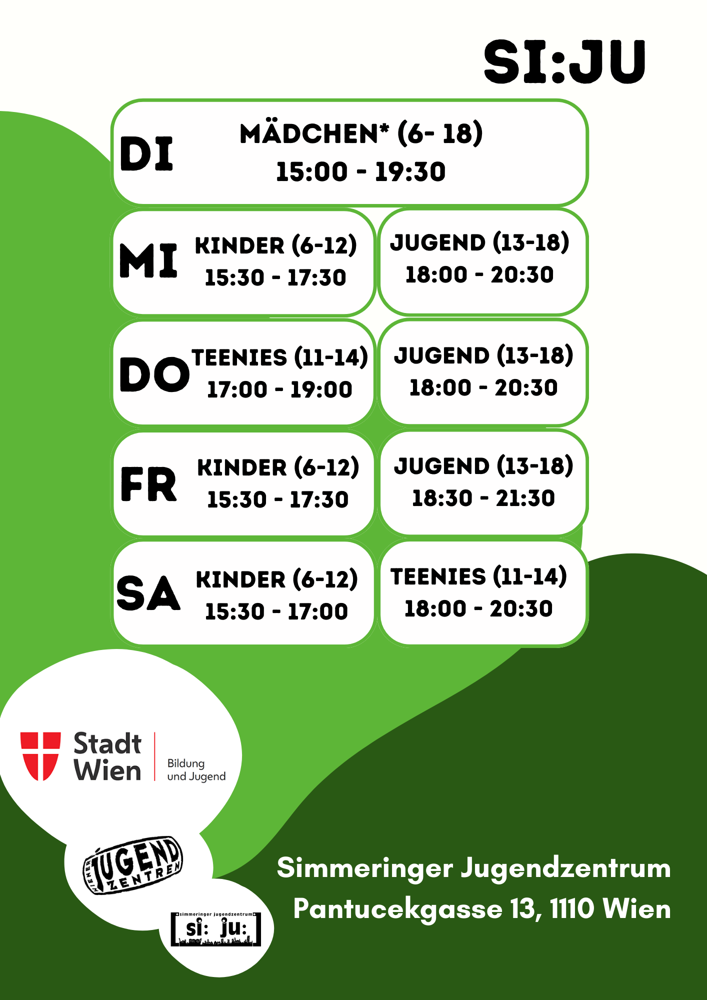 Das Si:Ju ist ein zentraler Ort der Begegnung und Kommunikation für Kinder, Teenies, Jugendliche und auch Erwachsene, die in einer Atmosphäre gegenseitigen Respekts soziale Kontakte erweitern und vertiefen wollen. Neben einem vielfältigen pädagogischen Spielangebot, das sportliche Aktivitäten ebenso umfasst wie erlebnisorientierte Gruppenerfahrungen, wird der nonformalen Bildungsarbeit breiter Raum gegeben. Diskussionsrunden zu relevanten Themen, Informationsabende und innovative kreative Angebote (Neue Medien, Siebdruck, Töpferei etc.) wechseln einander ab. Besonderer Wert wird auf die Möglichkeit gelegt, jugendkulturelle Ausdrucksformen kennen zu lernen. Regelmäßige Tanz- und DJ-Workshops finden ebenso statt wie experimentelle Foto- und Videoprojekte.